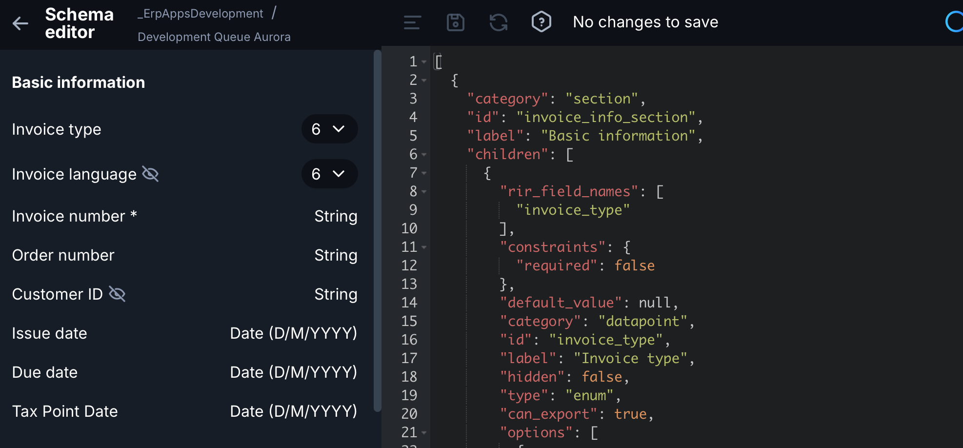Endringer i innstillingene i feltmenyen i Rossum vil automatisk endre det underliggende JSON-skjemaet for deg.