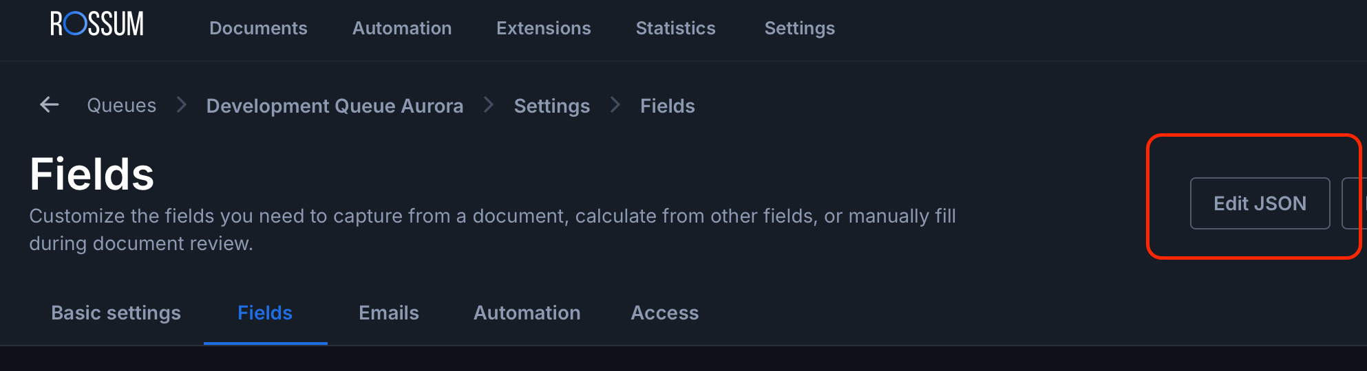 Du kan kontrollere og endre skjemaet ved å gå til «innstillinger > felt» i Rossum og deretter klikke på «rediger JSON»-knappen øverst til høyre på siden.