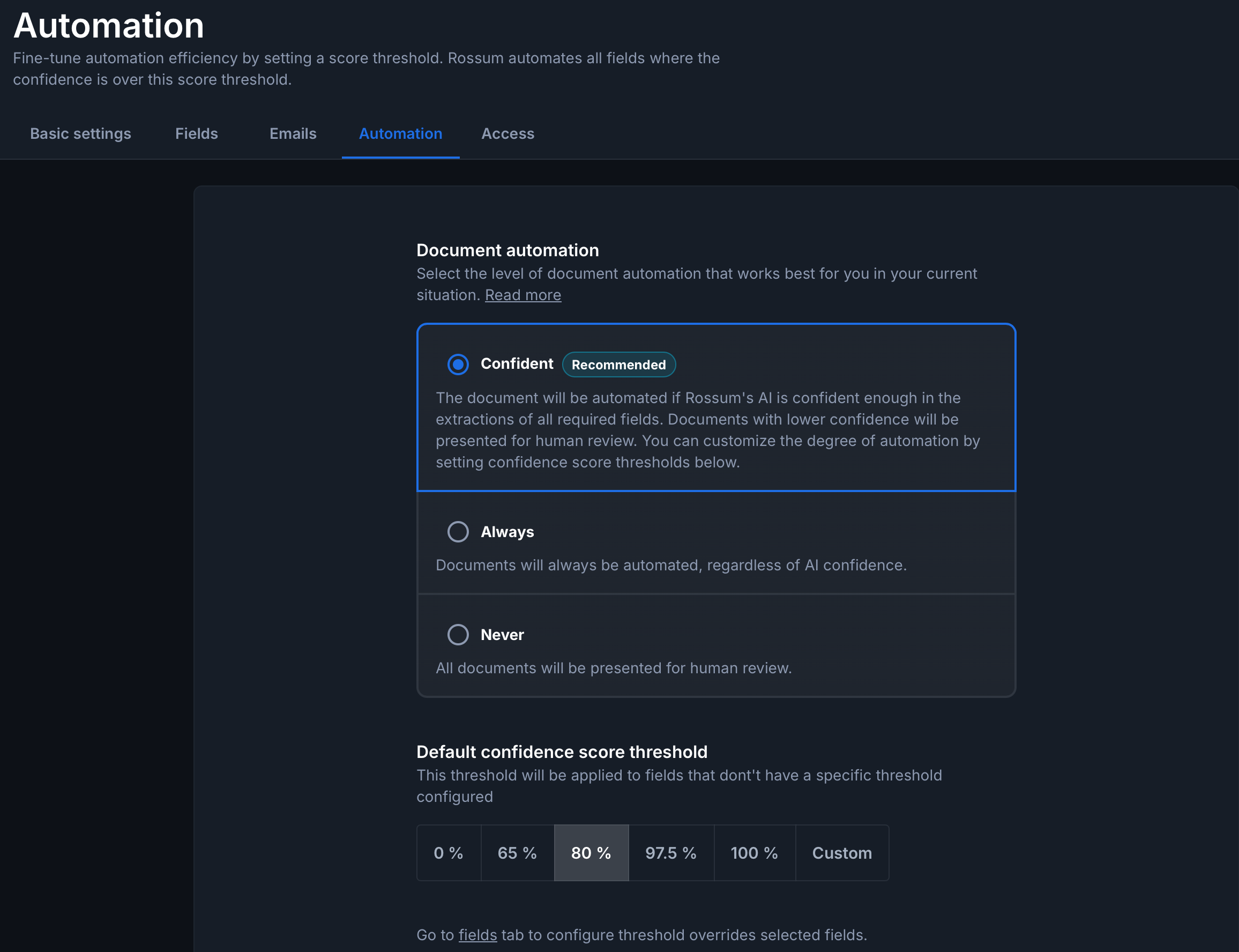 Nivået som AI-en automatiserer dokumenter på, kan angis i Rossum-innstillingene eller slås av helt.