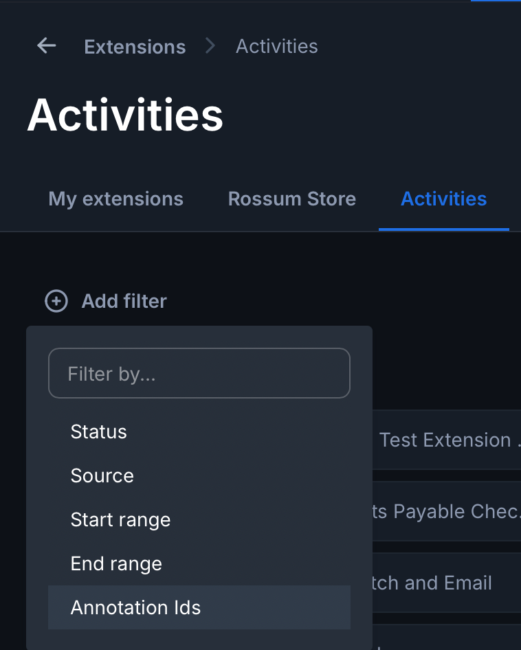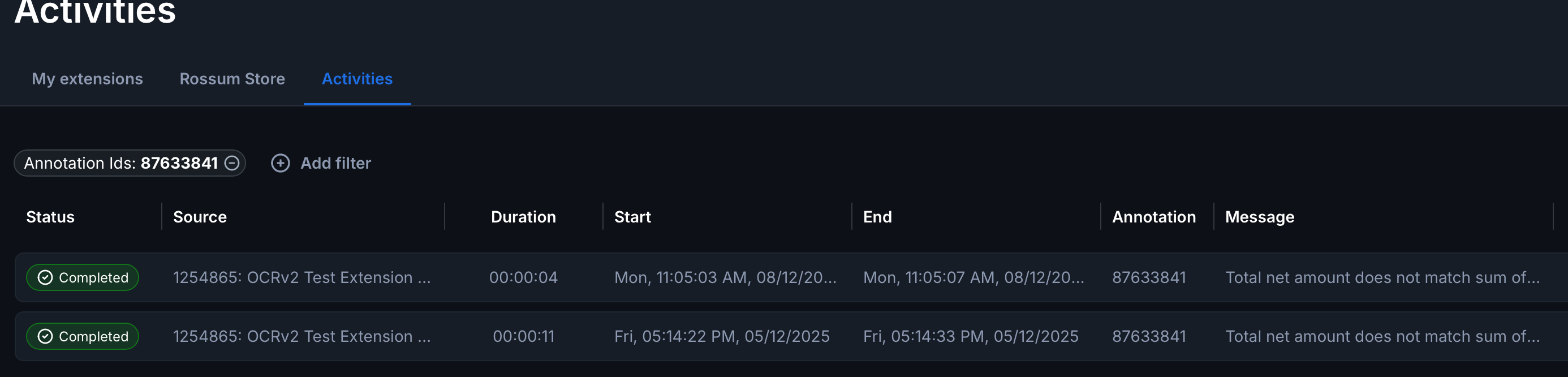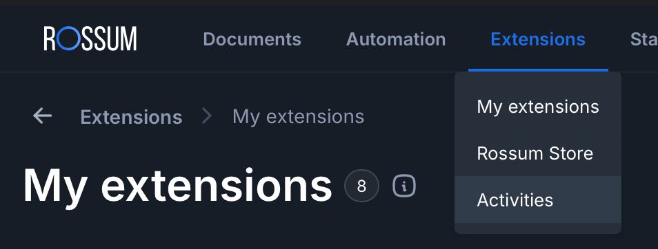 Hvis dette ikke løser problemet, kan du se på utvidelsesloggene på Rossum (nå kalt «aktiviteter»), som bør inneholde en detaljert feilmelding i svarseksjonen. Merk at noen brukere av vår hostede løsning kanskje ikke har tilgang til dette. I så fall kan du kontakte support for videre hjelp.