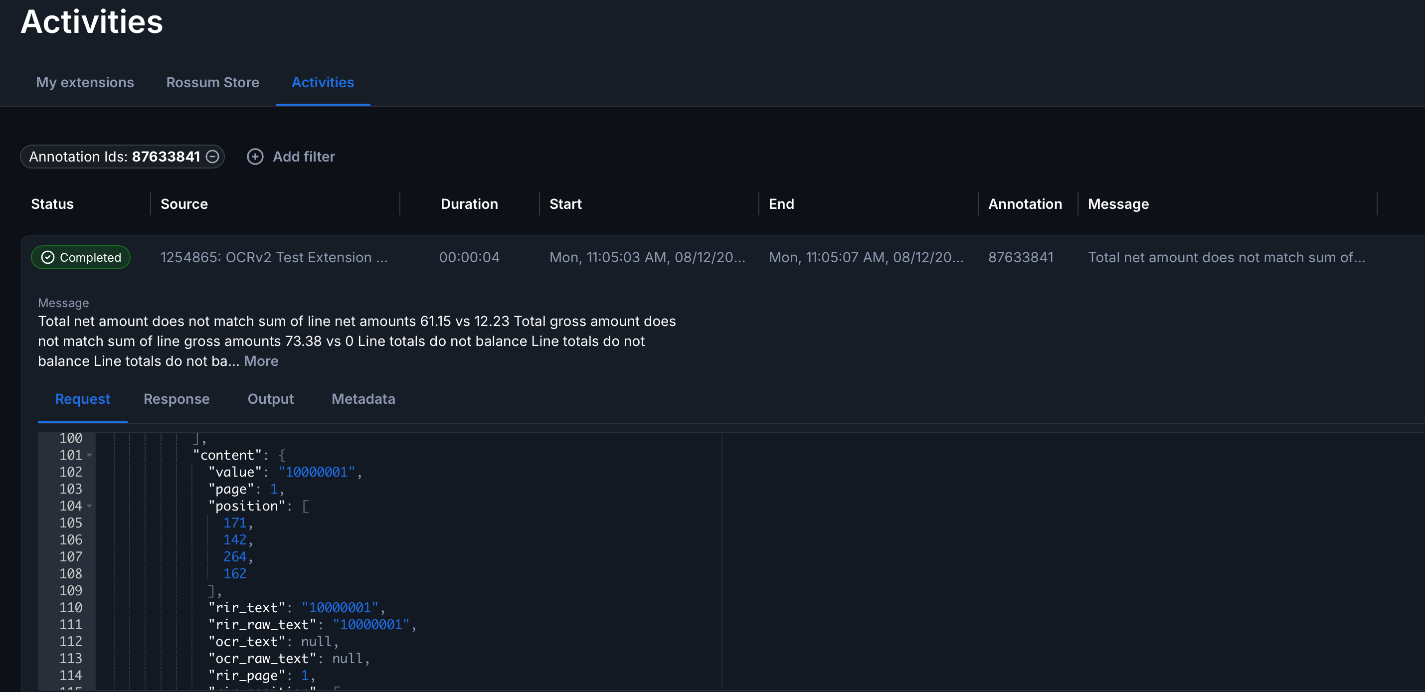 6. Hvis du utvider en aktivitet, kan du se detaljene under den:- Forespørsel : Dataene som Rossum sender til utvidelsen. Dette bør være et fullstendig dokumentobjekt, så du bør kunne finne alle dataene her.