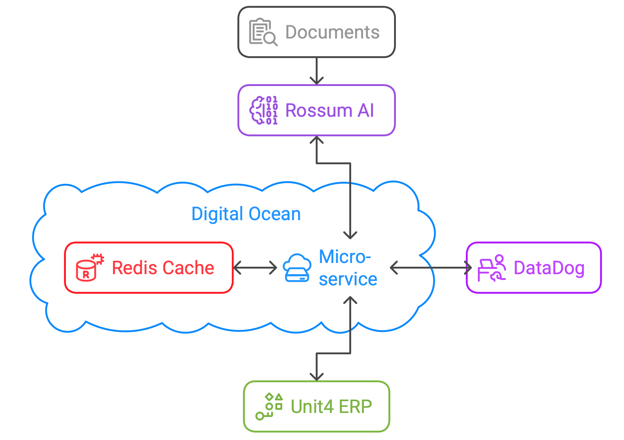 Mikrotjänst på Digital Ocean: Vår ERP-Apps AI OCR-mikrotjänst som söker i ditt Unit4 ERP efter matchande leverantörer, order och redovisningsinformation, utför beräkningar och kontroller där det behövs och slutligen formaterar och skickar data och dokument till ERP när det är tillfredsställande.