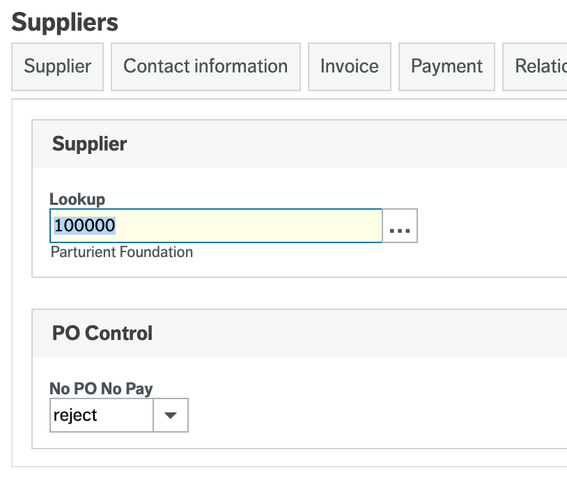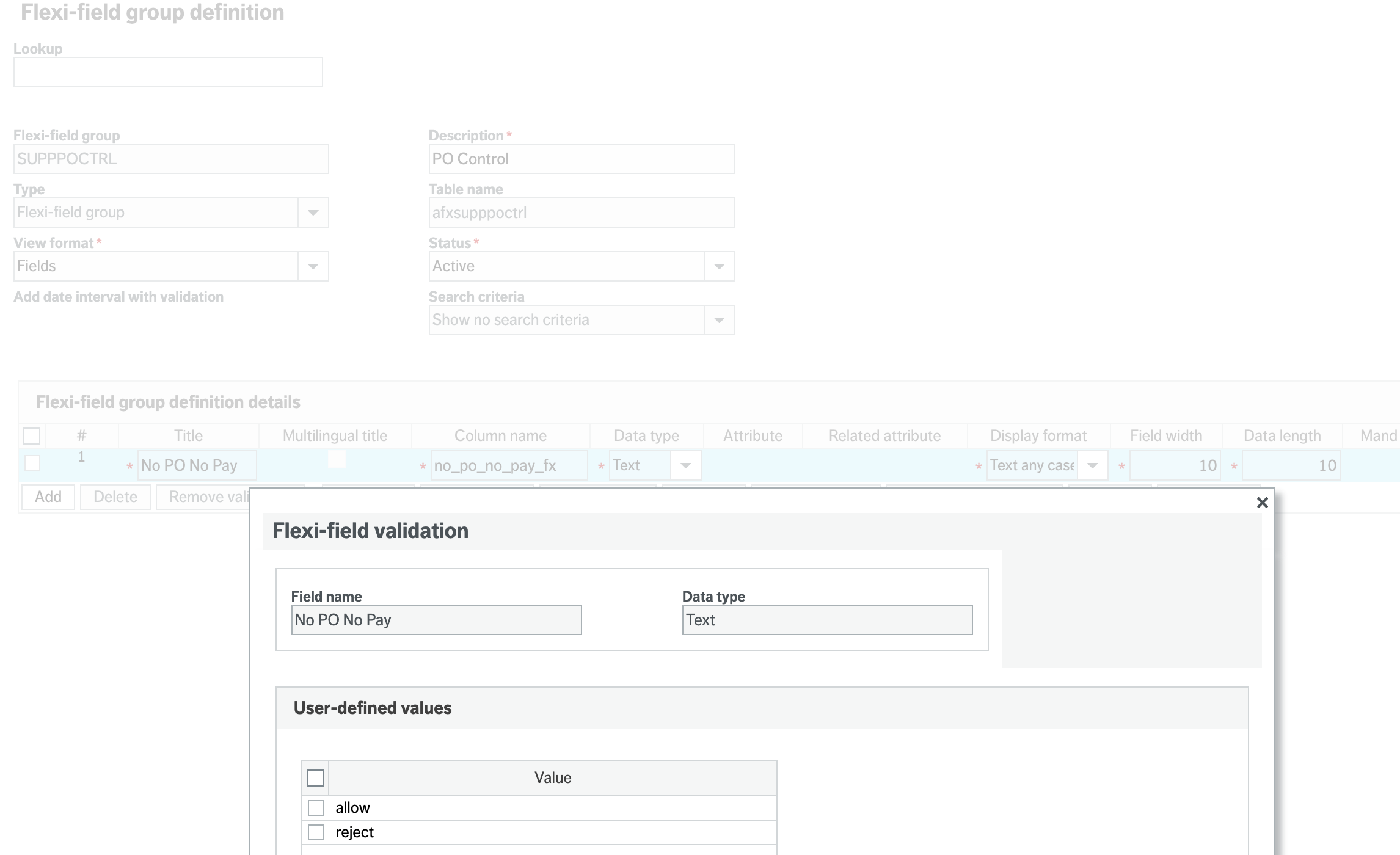 Du kanske vill konfigurera ett flexifält för att kunna stoppa fakturor om det inte finns någon inköpsorder. Se inställningen: nopurchaseorder